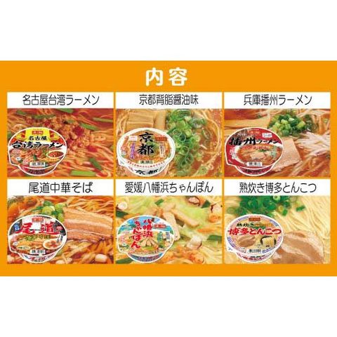 | 名古屋台湾ラーメン1個 京都背脂醤油味1個 兵庫播州ラーメン1個 尾道中華そば1個 愛媛八幡浜ちゃんぽん1個 熟炊き博多とんこつ1個 合計6個 |