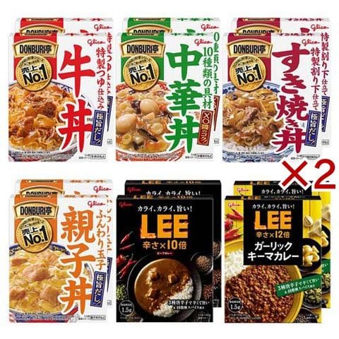 | DONBURI亭牛丼:2個 DONBURI亭中華丼:2個 DONBURI亭すき焼き丼:2個 DONBURI亭親子丼:2個 ビーフカレーLEE辛さ×10倍:2個 LEEガーリックキーマカレー辛さ×12倍:2個 |