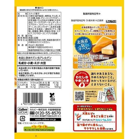 | 小麦粉(国内製造)、植物油、でん粉、えび、砂糖、食塩、クリーミングパウダー、粉末油脂、たん白加水分解物(大豆を含む)、チーズパウダー(チェダーチーズパウダー、カマンベールチーズパウダー)、オニオンパウダー、乳等を主要原料とする食品 / 調味料(アミノ酸等)、膨脹剤、香料、甘味料(甘草、ステビア、スクラロース)、パプリカ色素 |