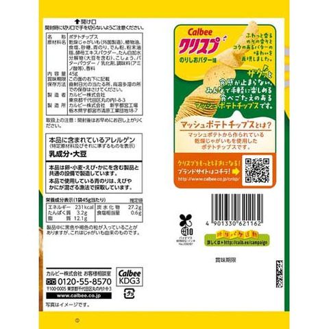 | 1袋45g当たり エネルギー:231kcal、たんぱく質:3.2g、脂質:12.1g、炭水化物:27.2g、食塩相当量:0.6g |