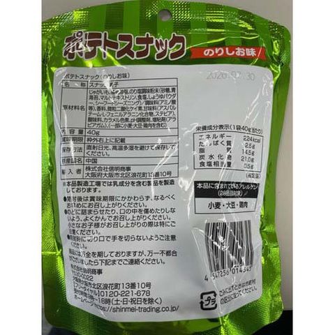 | 1袋40gあたり 熱量:224kcal、たんぱく質:2.5g、脂質:14.5g、炭水化物:21.0g、食塩相当量0.5g |