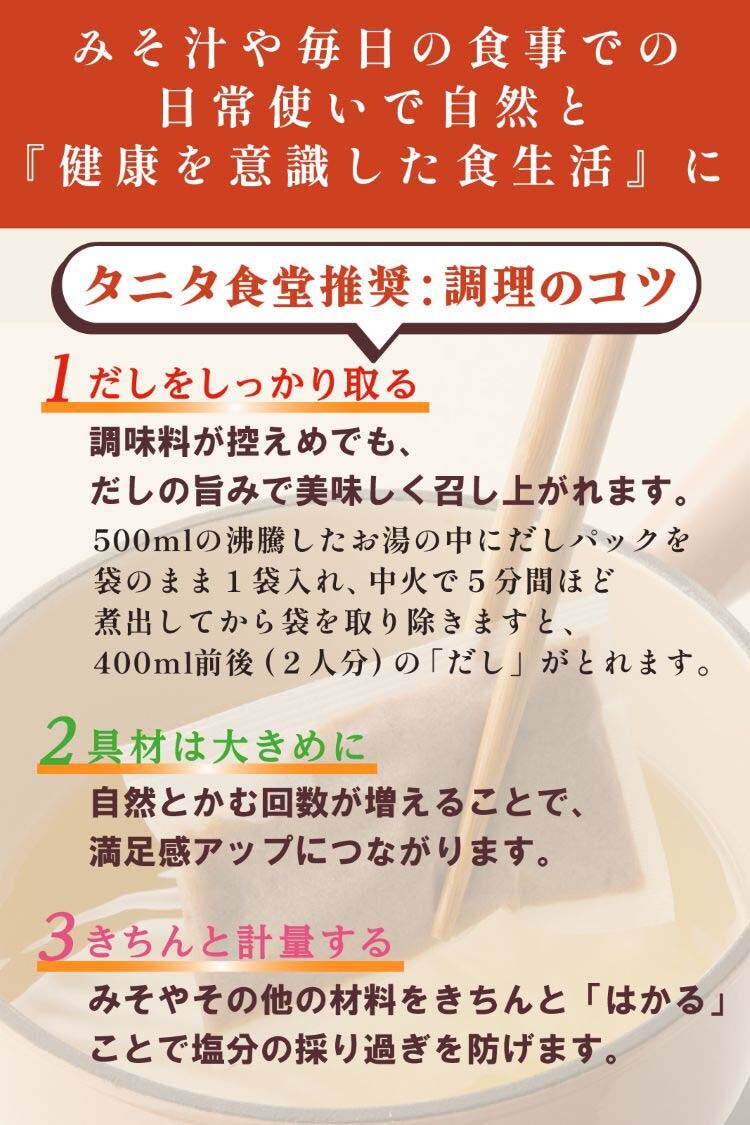 ●和食では欠かせない「だし」を通じて毎日の健康づくりをサポートしたいという想いから、タニタ食堂の監修のもと、「みそ汁によく合うだしパック」を共同開発しました。