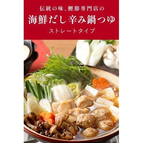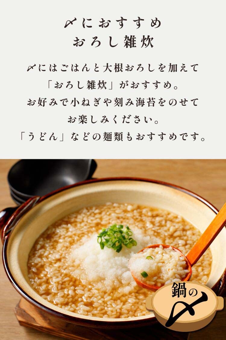 ●辛みの強い天鷹唐辛子を加え、ピリッと刺激的な辛さがあとを引く味わいの鍋つゆです。〆にはごはんと大根おろしを加えて「おろし雑炊」にし、お好みで小ねぎや刻み海苔をのせてお楽しみください。うどんなどの麺類もおすすめです。