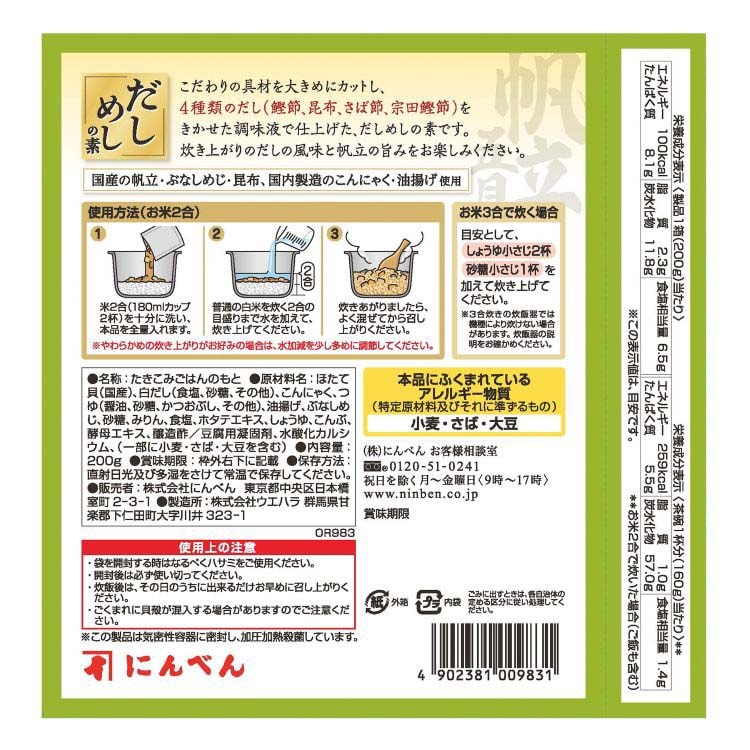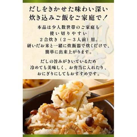 ●具材を活かす調味液には、だし素材に「国内製造の鰹節・さば節・宗田鰹節・北海道産昆布」の4種類をブレンドしたものを使用した「だしめしの素 帆立五目」です。炊き上がりのだしの風味と帆立の旨みをお楽しみください。