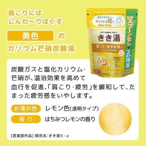 ●HOTな健康を、明日へ。心地よい炭酸に包まれて疲れをオフ※1 つら~い肩こり・疲労に黄色の「きき湯」