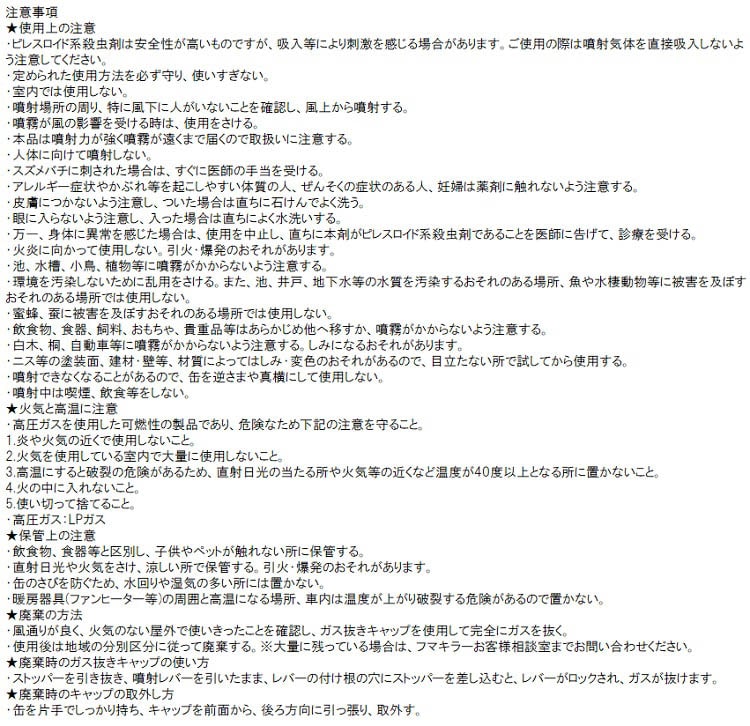 ・スズメバチが攻撃してくることがあるので、刺されないよう肌をおおい、噴射後はすみやかにその場所から離れる。