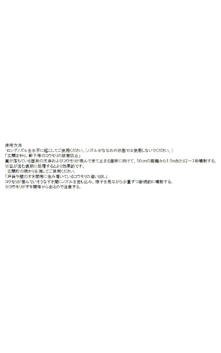 ・糞が落ちている箇所の天井およびコウモリが飛んで来て止まる箇所に向けて、50cmの距離から1.5mあたり2~3秒噴射する。