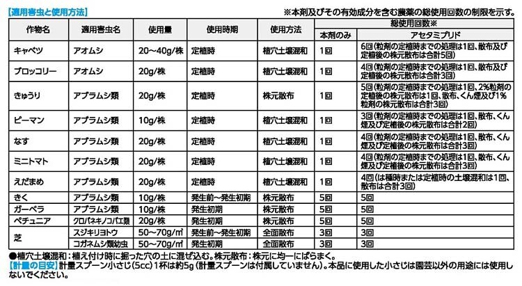 ・キャベツ、ブロッコリーに使用する際は、植穴に散布してから、薬剤の粒が見えなくなる程度まで土とよく混ぜてください。
