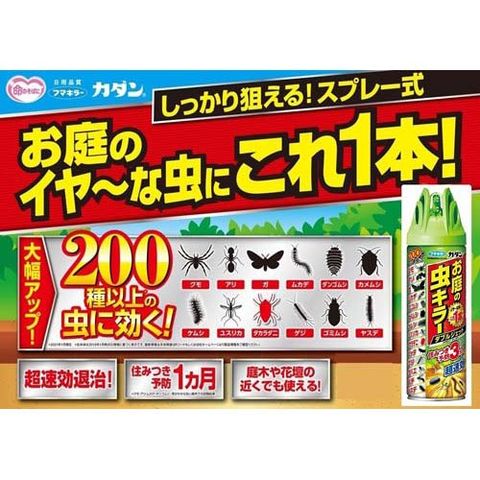 クモやアリ、ムカデなどのはう虫から、ガやカメムシなどの飛ぶ虫まで200種以上の害虫に効果を発揮。超速効殺虫成分の働きで、お庭のイヤな虫をすばやく退治します。