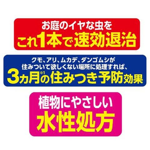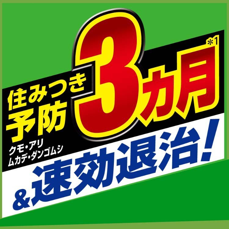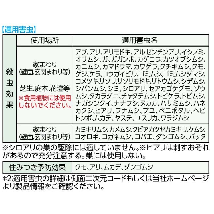 | 適用害虫:クモ、アリ、ガ、ムカデ、ダンゴムシ、カメムシ、ユスリカ、タカラダニ、バッタ、ゲジ、コバエ、ヤスデ他 |