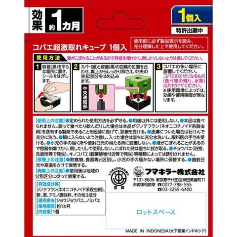 有効成分等:ジノテフラン(ネコチノイド系殺虫剤)、酢、酒、アミノ調味料、その他3成分