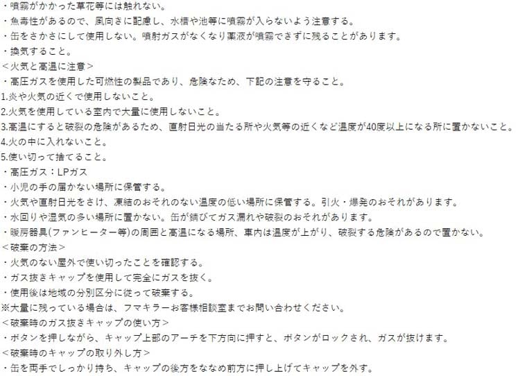 ・屋外において草むら、庭木まわり、物陰、地面等に噴霧する場合は、風上から、噴射量を加減して使用する等注意して1~2秒ずつ断続的に噴霧する。