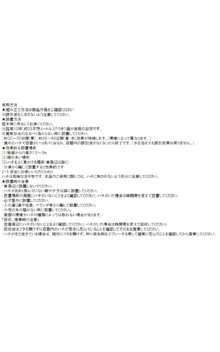 ・回収後はフタを開けずに容器内のハチが完全に死んでいることを確認してそのまま廃棄してください。