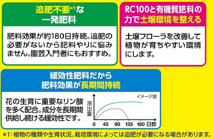 ※約180日間持続する肥料成分が配合されていますので栽培期間中に追肥は不要ですが、植物の種類や生育状況、栽培環境、栽培期間によっては必要になる場合があります。