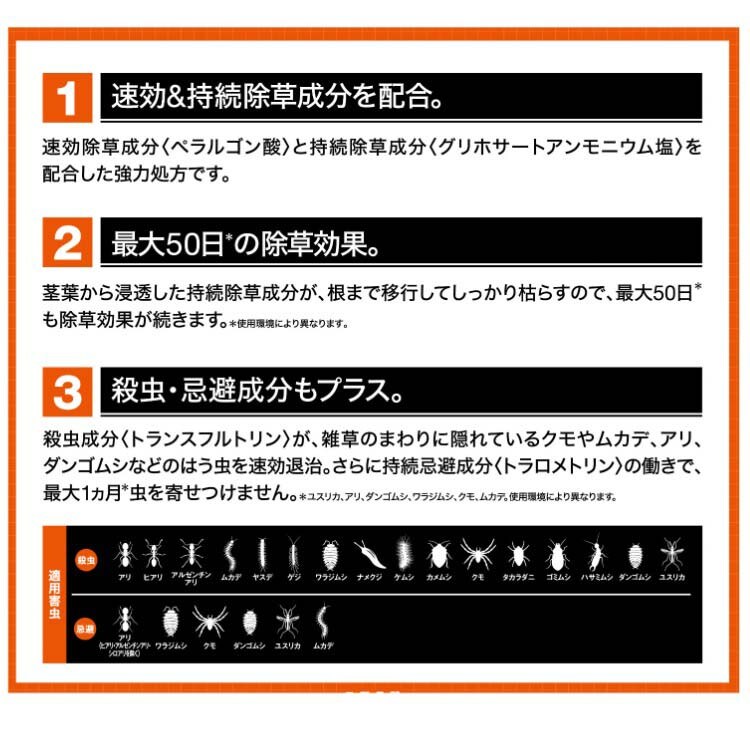 速効除草成分「ペラルゴン酸」と持続除草成分「グリホサートアンモニウム塩」を配合した強力処方です。
