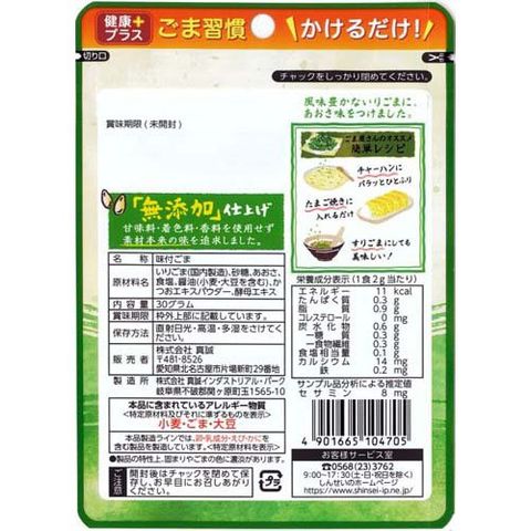 | 1食(2g)当たり エネルギー:11kcal、たんぱく質:0.3g、脂質:0.9g、コレステロール:0mg、炭水化物:0.6g(糖質:0.3g、食物繊維:0.3g)、食塩相当量:0.1g、カルシウム:14mg、鉄:0.2mg、セサミン:8mg |