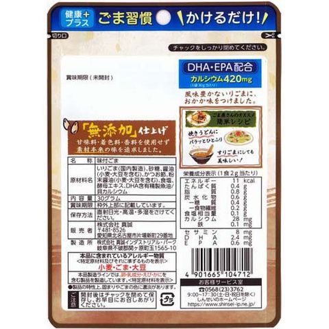 | 1食(2g)当たり エネルギー:11kcal、たんぱく質:0.4g、脂質:0.8g、炭水化物:0.6g(糖質:0.4g、食物繊維:0.2g)、食塩相当量:0.1g、カルシウム:28mg、鉄:0.1mg、セサミン:8mg、DHA:2.4mg、EPA:0.6mg |