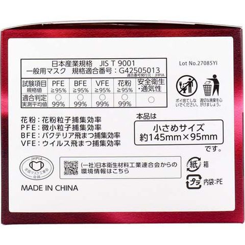 | 個装重量:約157g 内容量:50枚入 ★サイズ 小さめサイズ:約145mm×95mm ★素材 ・本体:ポリプロピレン ・耳部:ポリエステル ・ノーズフィッター:ポリエチレン |