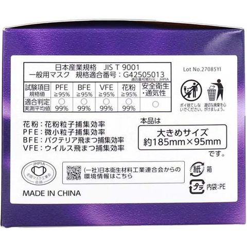 | 個装重量:約186g 内容量:50枚入 ★サイズ 大きめサイズ:約185mm×95mm ★素材 ・本体:ポリプロピレン ・耳部:ポリエステル ・ノーズフィッター:ポリエチレン |