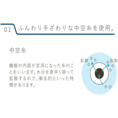 ●ふんわり手ざわりな中空糸を使用しています。中空糸とは繊維の内部が空洞になった糸のことをいいます。水分を素早く吸って拡散するので、衛生的といった特徴があります。