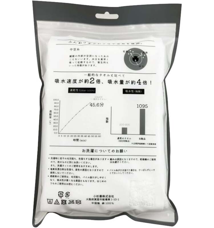 ●ふんわり手ざわりな中空糸を使用しています。中空糸とは繊維の内部が空洞になった糸のことをいいます。水分を素早く吸って拡散するので、衛生的といった特徴があります。