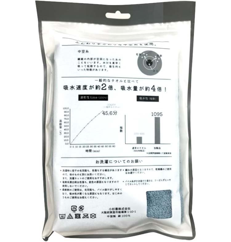 ●ふんわり手ざわりな中空糸を使用しています。中空糸とは繊維の内部が空洞になった糸のことをいいます。水分を素早く吸って拡散するので、衛生的といった特徴があります。