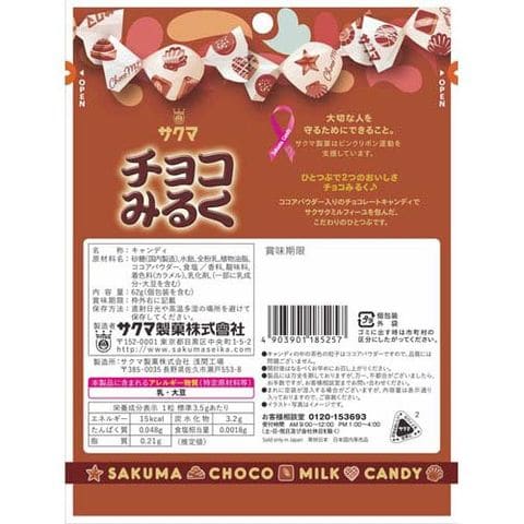 | 砂糖(国内製造)、水飴、全粉乳、植物油脂、ココアパウダー、食塩/香料、酸味料、着色料(カラメル)、乳化剤、(一部に乳成分・大豆を含む) |