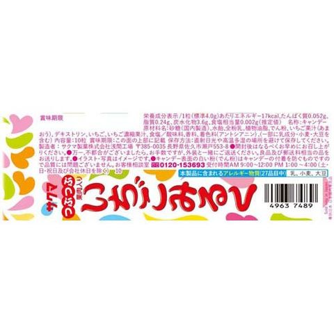 | 砂糖(国内製造)、水飴、全粉乳、植物油脂、でん粉、いちご果汁、デキストリン、いちご、食塩/酸味料、香料、着色料(アントシアニン)乳化剤、(一部に小麦・乳成分・大豆を含む) |