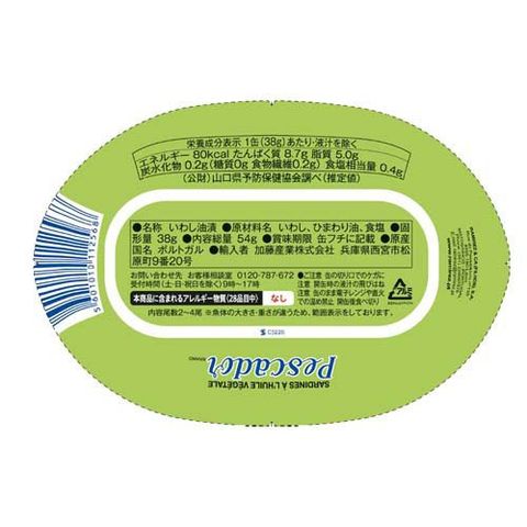 | 1缶(38g)あたり・液汁を除く 熱量:80kcal、たんぱく質:8.7g、脂質:5.0g、炭水化物:0.2g(糖質0g、食物繊維0.2g)、食塩相当量:0.4g |