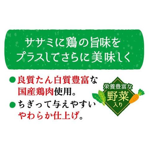 | 肉類(鶏・鶏ササミ)、小麦粉、植物性油脂、米粉、酵母エキス、チキンエキス、ほうれん草、にんじん、ソルビトール、加工でんぷん、グリセリン、リン酸塩(Na)、カゼインNa、炭酸Ca、着色料(βーカロテン・紅麹・クチナシ) |