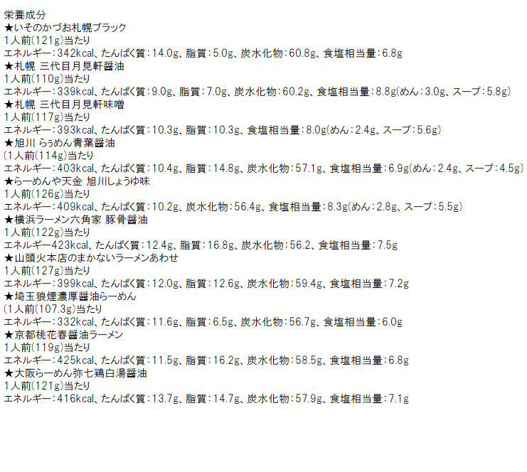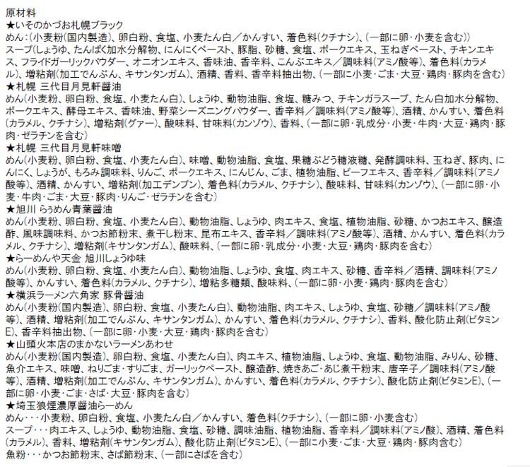 | ★いそのかづお札幌ブラック:卵・小麦・ごま・大豆・鶏肉・豚肉 ★札幌 三代目月見軒醤油:卵・乳成分・小麦・牛肉・大豆・鶏肉・豚肉・ゼラチン ★札幌 三代目月見軒味噌:卵・小麦・牛肉・ごま・大豆・豚肉・りんご・ゼラチン ★旭川 らぅめん青葉醤油:卵・乳成分・小麦・大豆・鶏肉・豚肉 ★らーめんや天金 旭川しょうゆ味:卵・小麦・大豆・鶏肉・豚肉 ★横浜ラーメン六角家 豚骨醤油:卵・小麦・大豆・鶏肉・豚肉 ★山頭火本店のまかないラーメンあわせ:卵・小麦・ごま・さば・大豆・豚肉 ★埼玉狼煙濃厚醤油らーめん:卵・小麦・ごま・さば・大豆・鶏肉・豚肉 ★京都桃花春醤油ラーメン:卵、小麦、大豆、豚肉 ★大阪らーめん弥七鶏白湯醤油:卵、小麦、大豆、鶏肉、豚肉 ★旭川 ラーメンふるき味噌:卵・小麦・ごま・大豆・豚肉 ★千葉 黒揚羽森住 らぁ麺黒中華醤油:卵・小麦・さば・大豆・鶏肉・豚肉・魚介類 ★函館 ラーメン屋まつ笠こってり味噌:卵、小麦、ごま、大豆、豚肉 ★札幌 八乃木 みそら~めん:卵・小麦・ごま・大豆・鶏肉・豚肉 ★旭川 みそラーメンのよし乃本店:卵・小麦・ごま・大豆・豚肉 ★函館 北浜商店とんこつ塩:卵・小麦・ごま・大豆・豚肉 ★東京 らぁ麺 はやし田 醤油:卵・小麦・大豆・鶏肉 ★兵庫らーめん専門和海塩ラーメン:卵、小麦、えび、さば、大豆、鶏肉、豚肉 ★札幌 ブタキング味噌:卵・小麦・落花生・大豆・豚肉 ★スープカリーキング監修スープカリーラーメン:卵・小麦・大豆・豚肉 |