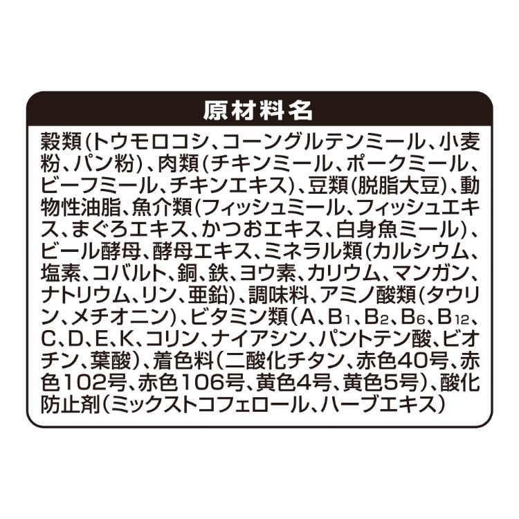 | 穀類(トウモロコシ、コーングルテンミール、小麦粉、パン粉)、肉類(チキンミール、ポークミール、ビーフミール、チキンエキス)、豆類(脱脂大豆)、動物性油脂、魚介類(フィッシュミール、フィッシュエキス、まぐろエキス、かつおエキス、白身魚ミール)、ビール酵母、酵母エキス、ミネラル類(カルシウム、塩素、コバルト、銅、鉄、ヨウ素、カリウム、マンガン、ナトリウム、リン、亜鉛)、調味料、アミノ酸類(タウリン、メチオニン)、ビタミン類(A、B1、B2、B6、B12、C、D、E、K、コリン、ナイアシン、パントテン酸、ビオチン、葉酸)、着色料(二酸化チタン、赤色40号、赤色102号、赤色106号、黄色4号、黄色5号)、酸化防止剤(ミックストコフェロール、ハーブエキス) |
