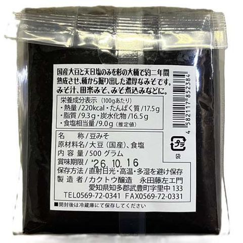 ●「カクトウ豆みそ」は、粒よりの国産大豆と天日塩を原料に杉の大桶で約二年間熟成させ、桶から掘り出した濃厚なみそです。