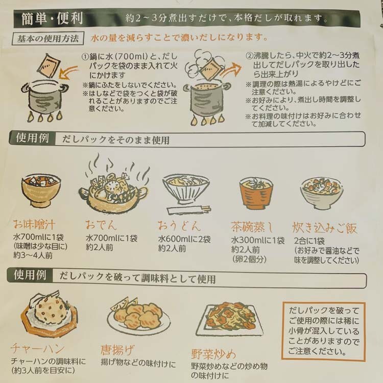 ●忙しい主婦の方達にお料理でもっと「らく」して欲しいとの思いで、簡単で便利なティーバック方式を採用いつものお料理に入れるだけで、料亭の味に大変身。