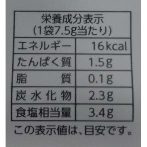 | 1袋7.5g当たり エネルギー:16kcal、たんぱく質:1.5g、脂質:0.1g、炭水化物:2.3g、食塩相当量:3.4g |