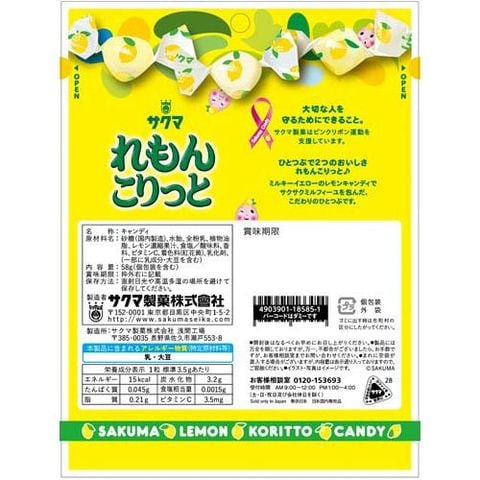 | 砂糖(国内製造)、水飴、全粉乳、植物油脂、レモン濃縮果汁、食塩/酸味料、香料、ビタミンC、着色料(紅花黄)、乳化剤、(一部に乳成分・大豆を含む) |