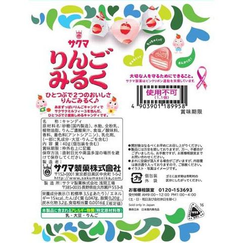 | 砂糖(国内製造)、水飴、全粉乳、植物油脂、りんご濃縮果汁、食塩/酸味料、香料、着色料(アントシアニン)乳化剤、(一部に乳成分・大豆・りんごを含む) |