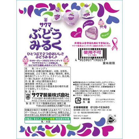 | 砂糖(国内製造)、水飴、全粉乳、植物油脂、ぶどう果汁、食塩/酸味料、香料、着色料(アントシアニン、クチナシ)乳化剤、(一部に乳成分・大豆を含む) |