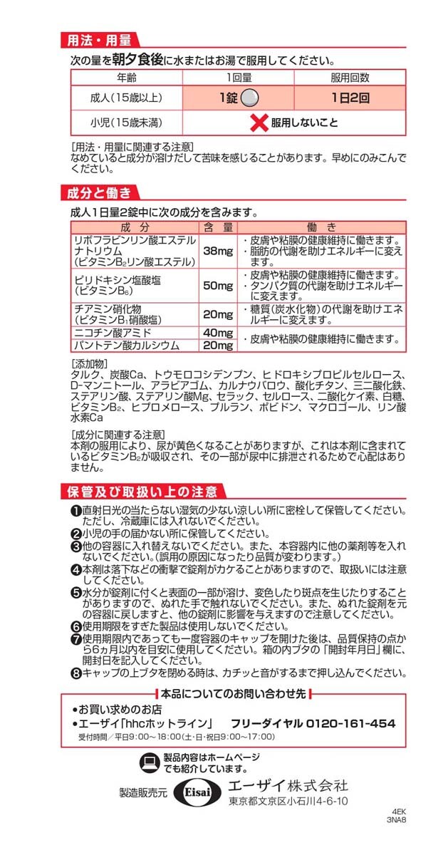 | 成人1日量2錠中に次の成分を含みます。 [成分:含量:働き] リボフラビンリン酸エステルナトリウム(ビタミンB2リン酸エステル):38mg:・皮膚や粘膜の健康維持に働きます。・脂肪の代謝を助けエネルギーに変えます。 ピリドキシン塩酸塩(ビタミンB6):50mg:・皮膚や粘膜の健康維持に働きます。・タンパク質の代謝を助けエネルギーに変えます。 チアミン硝化物(ビタミンB1硝酸塩):20mg:・糖質(炭水化物)の代謝を助けエネルギーに変えます。 ニコチン酸アミド:40mg:・皮膚や粘膜の健康維持に働きます。 パントテン酸カルシウム:20mg:・皮膚や粘膜の健康維持に働きます。 ★添加物 タルク、炭酸Ca、トウモロコシデンプン、ヒドロキシプロピルセルロース、D-マンニトール、アラビアゴム、カルナウバロウ、酸化チタン、三二酸化鉄、ステアリン酸、ステアリン酸Mg、セラック、セルロース、二酸化ケイ素、白糖、ビタミンB2、ヒプロメロース、プルラン、ポビドン、マクロゴール、リン酸水素Ca ★成分に関連する注意 本剤の服用により、尿が黄色くなることがありますが、これは本剤に含まれているビタミンB2が吸収され、その一部が尿中に排泄されるためで心配はありません。 |