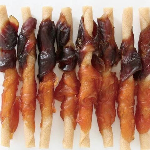 ●低脂肪、良質たん白質豊富なササミと鉄分豊富で味わい深い砂ぎもをやわらかく仕上げて、芯までおいしく食べられるやわらか弾力ガムに巻きました。