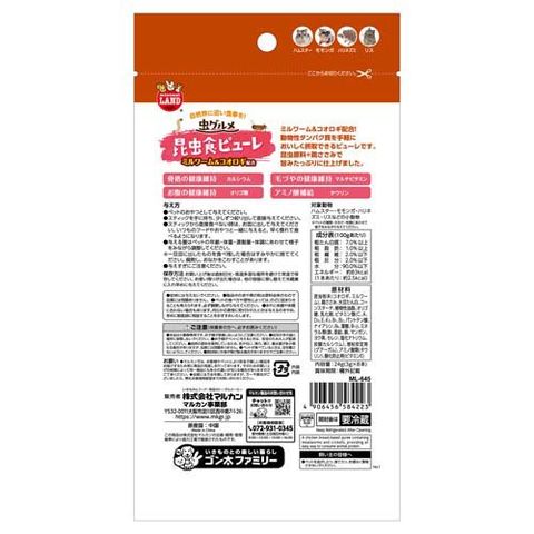 | 昆虫粉末(コオロギ、ミルワーム)、鶏ささみ、大豆たん白、コーンスターチ、植物性油脂、オリゴ糖、乳化剤、ビタミン類(C、A、D3、E、K3、B1、B2、パントテン酸、ナイアシン、B6、葉酸、B12)、ミネラル類(鉄、亜鉛、銅、マンガン、ヨウ素、セレン、塩化ナトリウム、炭酸カルシウム)、増粘安定剤(グアーガム)、アミノ酸類(タウリン)、酸化防止剤(ビタミンE) |