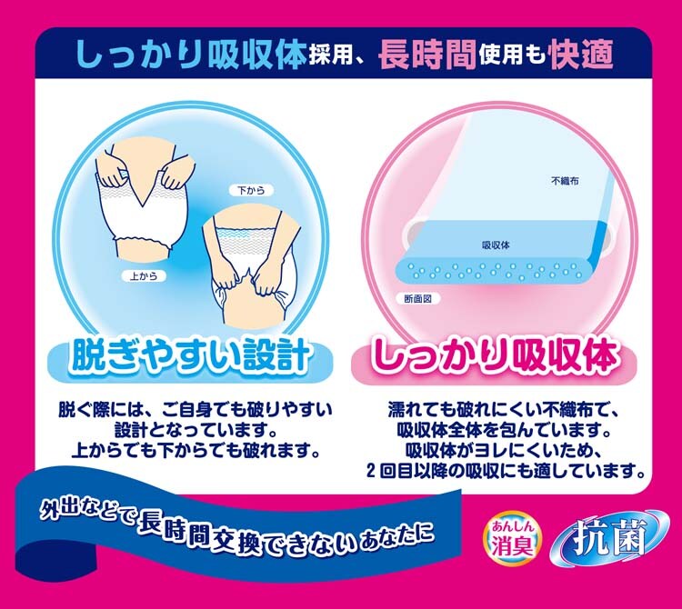 (3)取りかえる場合は、小便のときは、そのまま脱ぐか、両サイドを破って脱ぎます。大便のときは、両サイドを破って脱ぎます。