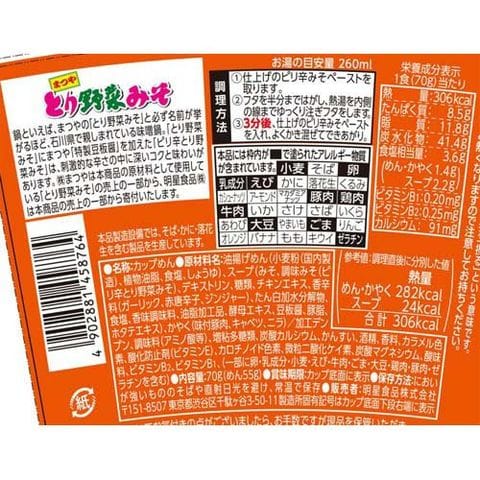 | 油揚げめん(小麦粉(国内製造)、植物油脂、食塩、しょうゆ)、スープ(みそ、調味みそ(ピリ辛とり野菜みそ)、デキストリン、糖類、チキンエキス、香辛料(ガーリック、赤唐辛子、ジンジャー)、たん白加水分解物、食塩、香味調味料、油脂加工品、酵母エキス、豆板醤、豚脂、ホタテエキス)、かやく(味付豚肉、キャベツ、ニラ)/加工デンプン、調味料(アミノ酸等)、増粘多糖類、炭酸カルシウム、かんすい、酒精、香料、カラメル色素、酸化防止剤(ビタミンE)、カロチノイド色素、微粒二酸化ケイ素、炭酸マグネシウム、酸味料、ビタミンB2、ビタミンB1、(一部に卵・乳成分・小麦・えび・牛肉・ごま・大豆・鶏肉・豚肉・ゼラチンを含む) |