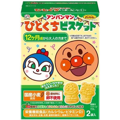 ●アンパンマンひとくちビスケット:アンパンマンとなかまたちの形をした、やさいとくだもの味のビスケットです。国産小麦を使用、原材料に卵不使用です。