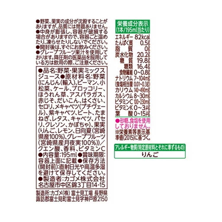 | 1本(195ml)当たり エネルギー:82kcal、たんぱく質:0.5g、脂質:0g、炭水化物:20.2g(糖質:19.8g、糖類:16.4g、食物繊維:0-0.8g)、ナトリウム:7-104mg(食塩相当量:0.01-0.3g)、カリウム:140-490mg、カルシウム:8-30mg、ビタミンC:100-230mg、ビタミンK:0-3μg、葉酸:0-15μg |
