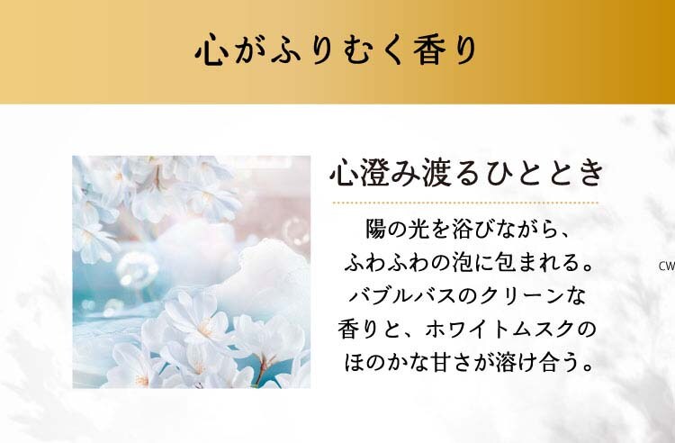 ●バブルバスのクリーンな香りと、ホワイトムスクのほのかな甘さが溶け合う。
