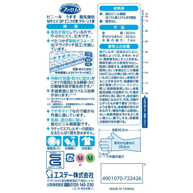 【ファミリー 家庭用手袋 ビニール 手袋 うす手 指先強化 M 3双パック 掃除 洗濯 用の商品詳細】