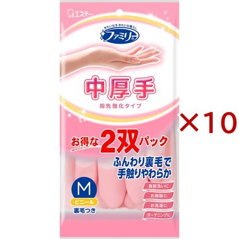 ファミリー ビニール 手袋 中厚手 指先強化 Mサイズ 2双パック 掃除 洗濯 食器洗い用 (10セット)