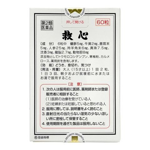 | 六粒中に次の成分を含みます。 蟾酥:五mg、牛黄:二mg、鹿茸末:五mg、人参:二十五mg、羚羊角末:六mg、真珠:七.五mg、沈香:三mg、龍脳:二.七mg、動物胆:八mg 添加物としてトウモロコシデンプン、寒梅粉、カルメロース、薬用炭を含有します。 ☆救心はすぐれた効果を発揮できるように配合が考えられております。 ☆救心は服用しやすい小さな丸剤で、崩壊性にすぐれ、薬効成分がすみやかに吸収されるよう工夫されております。 |
