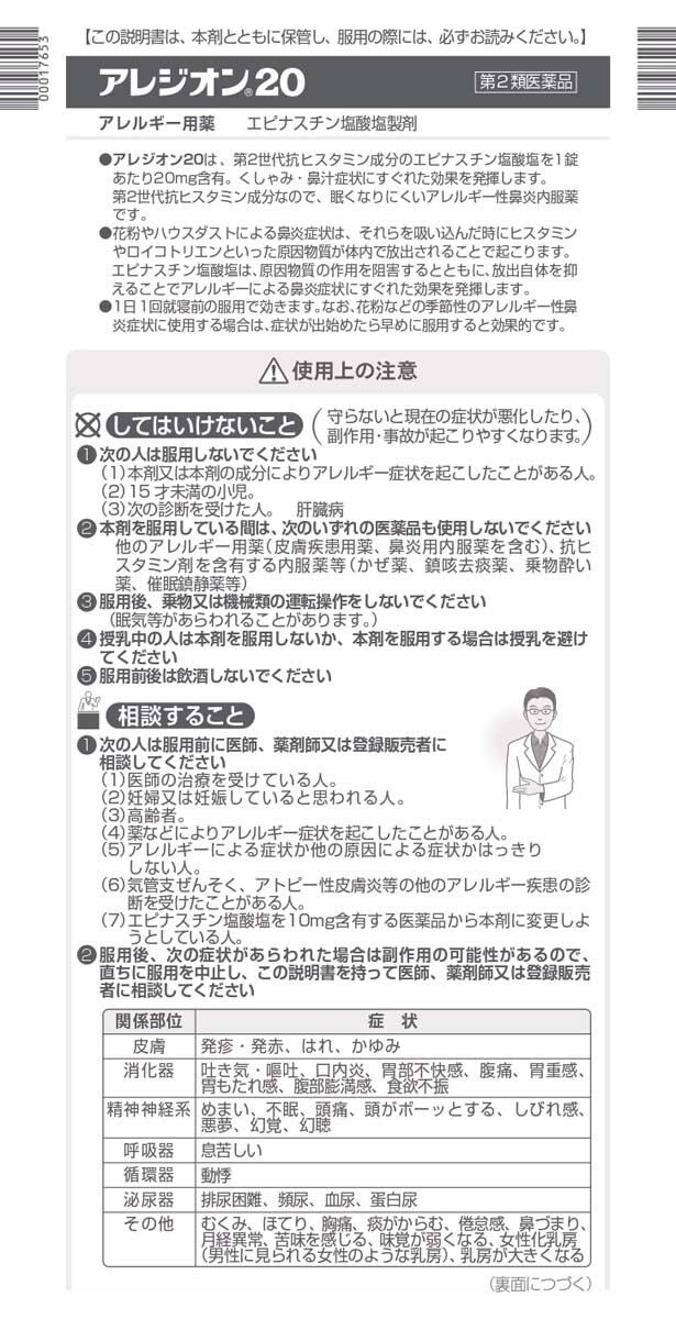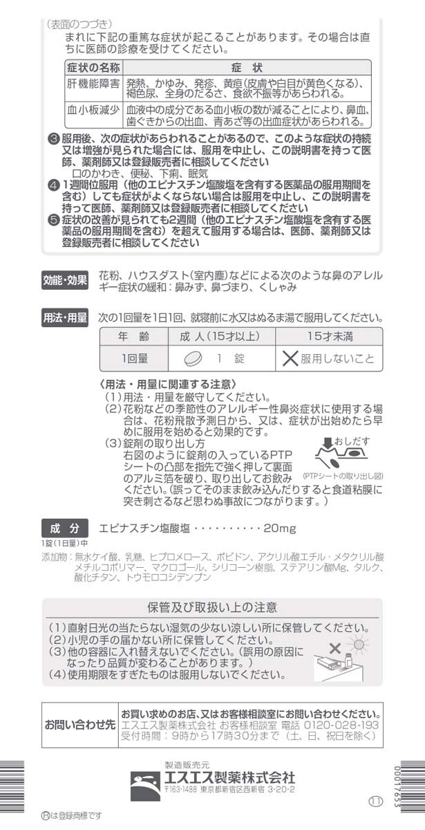4.1週間位服用(他のエピナスチン塩酸塩を含有する医薬品の服用期間を含む)しても症状がよくならない場合は服用を中止し、この説明書を持って医師、薬剤師又は登録販売者に相談してください